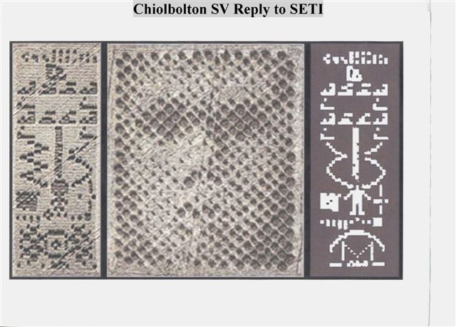 "CHILBOLTON WOMAN" IS AN IMAGE [below] OF A FEMALE PERSON OF STAR AD-LEONIS THAT ITS PEOPLE TRANSMITTED IN A RADIO SIGNAL TO EARTH. THEIR TRANSMISSION WAS IN RESPONSE TO AN EARLIER PICTOGRAPHIC-MESSAGE RADIO SIGNAL WHICH EARTH'S NASA-SETI ASTRONOMERS SENT INTO DEEP SPACE USING A RADIO TELESCOPE. (TO SEE THAT U.S. IMAGE AND GET MORE INFORMATION, GO TO: www.strangerdimensions.com/2013/03/16/the-arecibo-message/ ) [AD-Leonis people live on a planet orbiting red dwarf star AD-Leonis (Gliese 388), 16 light years away.] AD-LEONIS PEOPLE DECODED THE TRANSMISSION AND RESPONDED TO IT WITH A RADIO SIGNAL MESSAGE TRANSMISSION OF THEIR OWN. They transmitted the image of an AD-Leonis woman embedded in a coded energy-bundle that created a crop-circle image of her in the wild grass field RIGHT NEXT TO CHILBOLTON RADIO TELESCOPE OBSERVATORY IN ENGLAND, WHERE UK ASTRONOMERS COULDN'T MISS IT, WOULD KNOW ABOUT THE EARLIER SETI IMAGERY TRANSMISSION, AND THUS WOULD RECOGNIZE THAT AD LEONIS CROP CIRCLE 'PHOTO' [below] AS IN REPLY TO THE NASA-SETI IMAGE. THE RESPONDING IMAGE ALSO HAS A PICTOGRAPHS COLUMN ON THE LEFT RESPONDING TO NASA'S PICTOGRAPHS COLUMN (ON THE RIGHT), REPLYING TO EACH ITEM AS IT APPLIED TO AD LEONIS PEOPLE! (So simple even an Earthling can figure it out.)
