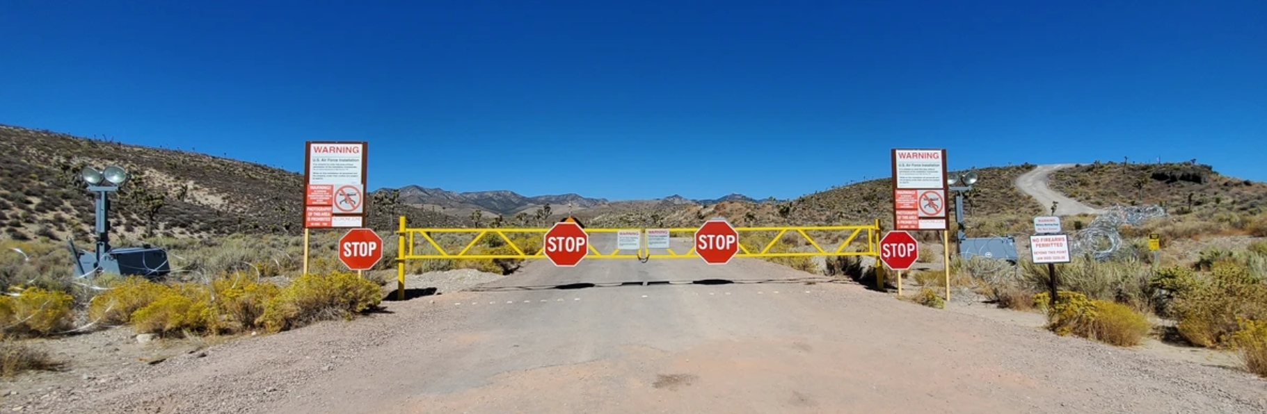 AREA-51 MAIN GATE, HEAVILY-GUARDED. NOTE WARNING SIGNS: 'RESTRICTED AREA; MILITARY INSTALLATION'. [Photos above.] Trespassing into Area 51 is a serious Federal crime: $10,000 fine and prison time. Armed DoE security-guard contractors ruthlessly patrol Area 51, backed up as needed by helicopter gunships.